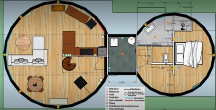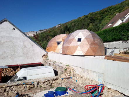 A proximité de Dijon, réalisation de deux dômes géodésiques collés l'un à l'autre pour en faire une habitation principale.