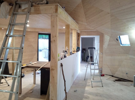 Dôme géodésique f3 de 20m² avec terrasse, isolé en laine de roche (100mm), il est installé sur pilotis, il aura la fonction d'une chambre. Sera recouvert de brande de bruyère. Ce dôme constitue une jolie extension à la maison principale.