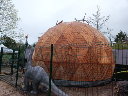 Dôme géodésique f4 de 40m² réalisé à Paris au jardin d'acclimatation. C'est un espace pour accueillir une animation de réalité virtuelle sur le thème des dinosaures. Mon client Modimage a réalisé un super covering de forêt sur chaque facette des triangles intérieur.