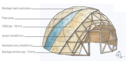 Dôme géodésique f3 de 20m² avec uniquement la structure du dôme et la structure pilotis, la structure est prévue en 100mm d'épais pour garantir une bonne isolation. Ma cliente Carole, s'occupera de l'isolation et de étanchéité par elle même.